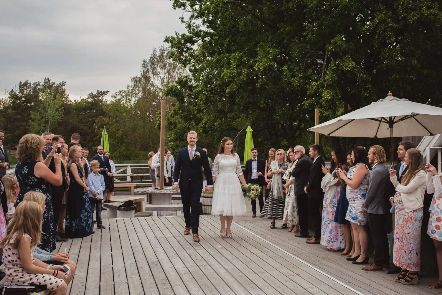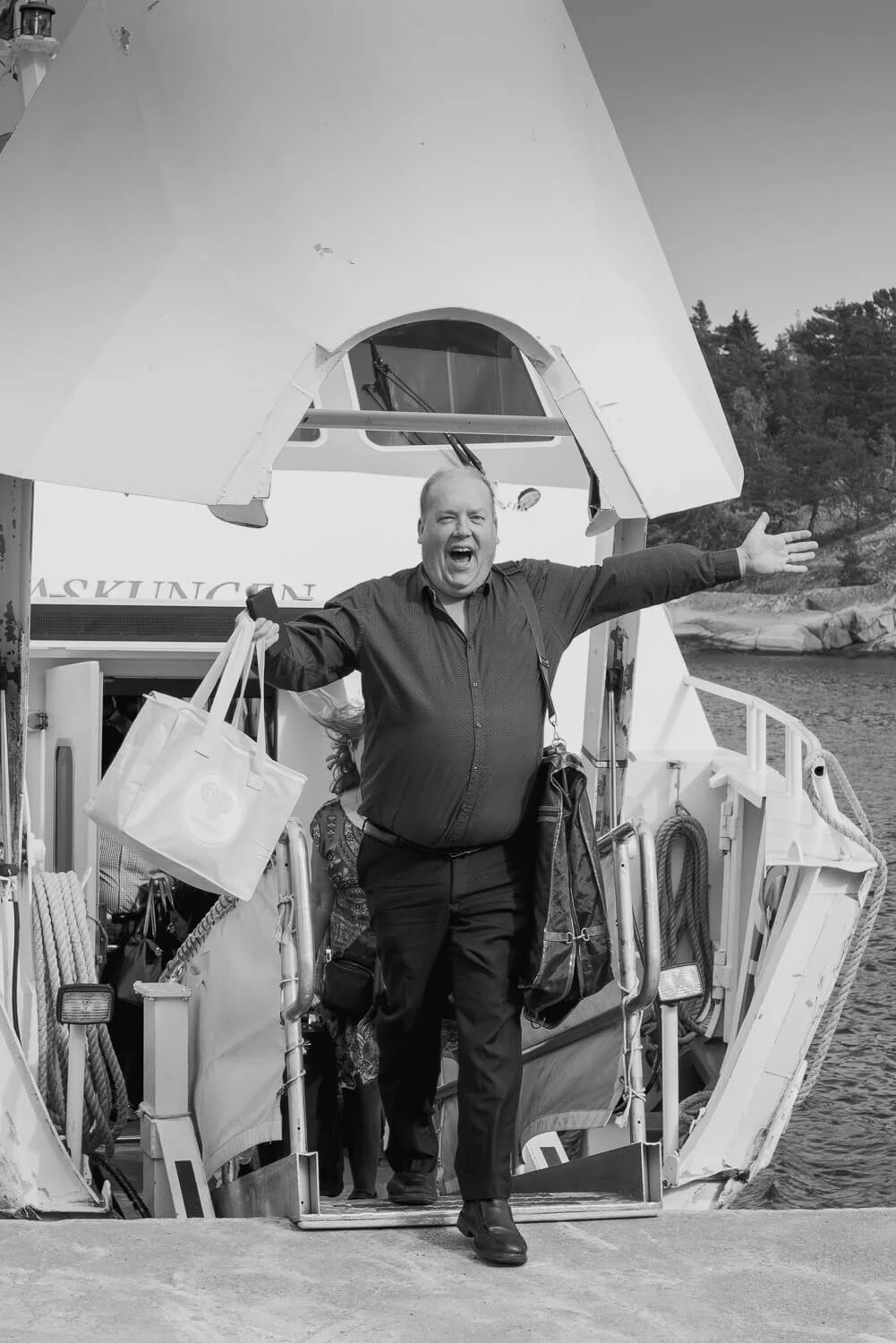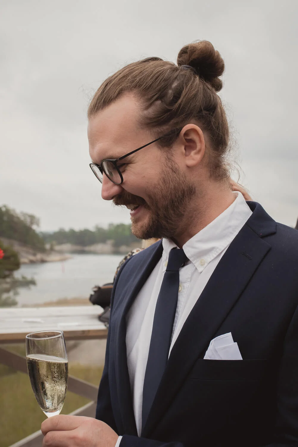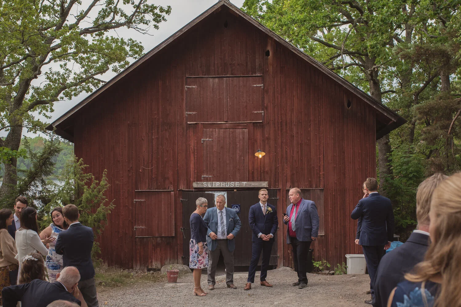 I början på hösten, precis när löven börjar fundera på att skifta i färg, men medans värmen fortfarande kan tillåta ett dopp från båten, så höll Carolina & Dennis sitt bröllop på Finnhamn i Stockholms skärgård. Det var en avslappnad och härlig dag med gäster från hela landet och från andra sidan Atlanten. Carolina var fantastiskt söt i sin korta klänning och jag fick äkta skärgårdskänsla när jag såg henne första gången och kom att tänka på Malin i saltkråkan i sin brudklänning. Skärgårdsmiljön behöver inte så mycket utsmyckning för att bli speciell men detaljer är ju alltid roligt och Carro & Dennis hade lagt ner mycket omsorg i sin dukning där varje bord hade en koppling till en speciell plats eller händelse i deras liv, med massor av roliga dekorationer som hörde ihop med temat. Sliphuset på Finnhamn är inte den traditionella bröllopslokalen, utan verkligen unik och hur mysig som helst! Tillsammans med maten och personalen är verkligen en perfekt inramning till en kärleksfest i skärgården!